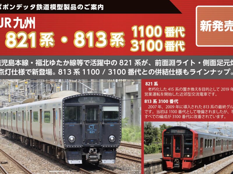 発売予定 JR九州821系・813系1100番代3100番代 by poponPosted on2026-02-042026-02-06 鹿児島本線・福北ゆたか線で活躍中の821系が、側面足元灯点灯仕様で新登場。813系1100/3100番代との併結仕様もラインナップ。 821系老朽化した415系の置き換えを目的とし… Share this... Facebook Twitter Pinterest Read More